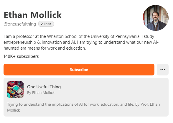 I am a professor at the Wharton School of the University of Pennsylvania. I study entrepreneurship & innovation, as well as how we can better learn and teach. I am trying to understand what our new AI-haunted era means for work and education.