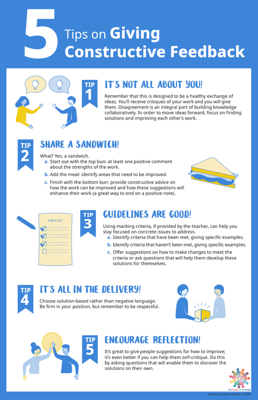 Text of the 5 Tips on Giving Constructive Feedback infographic. Be sure to checkout the infographic, designed by Kana Yasufuku, on this page.